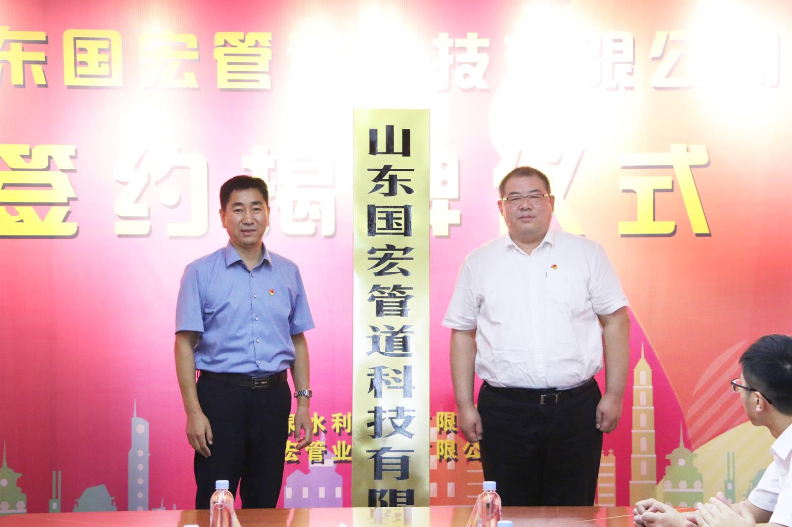隨后,公司副總裁孔智勇與清源水務集團黨委委員徐超代表雙方企業簽訂合作協議。臨朐縣水利局局長王興起與公司總裁倪奉堯為山東國宏管道科技有限公司揭牌。