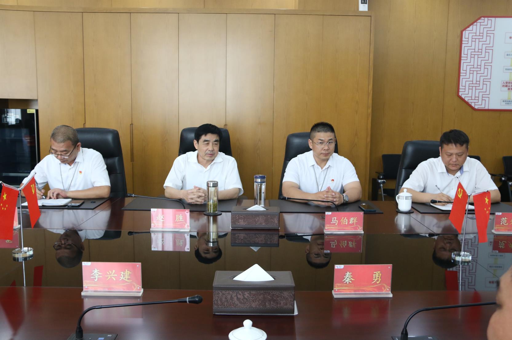 6月21日,濟寧能源組織人事部主任秦勇、副主任李興建,融匯物產黨委副書記、紀委書記黃躍來公司考察交流。集團黨建指導員趙勝,公司監事會主席、辦公室主任馬伯群,教培部副部長鄭軍,山東工礦市場經理范先彬陪同。